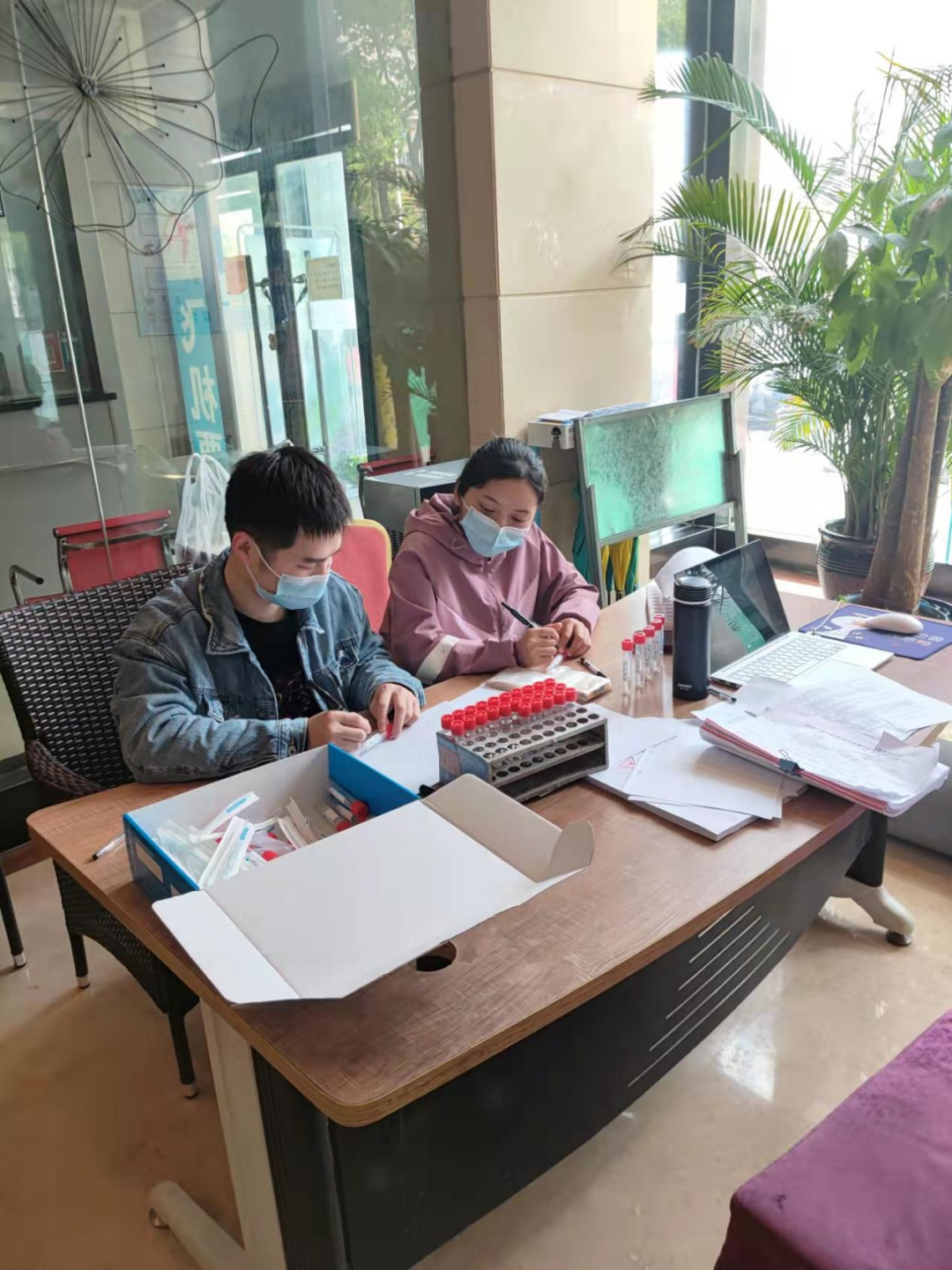 羅民被派駐的工作點(diǎn)是在一個(gè)隔離酒店的7樓,這里住有需要集中醫(yī)學(xué)觀察的人員近130人。由于醫(yī)務(wù)人員只有3人,他主動承擔(dān)了入駐和離開登記,以及需要經(jīng)常跑動、體力消耗較大的所有隔離人員每天兩次的體溫監(jiān)測登記、每天的核酸檢測采樣以及環(huán)境檢測工作,并要協(xié)助完成消殺和醫(yī)療垃圾的處置任務(wù)。