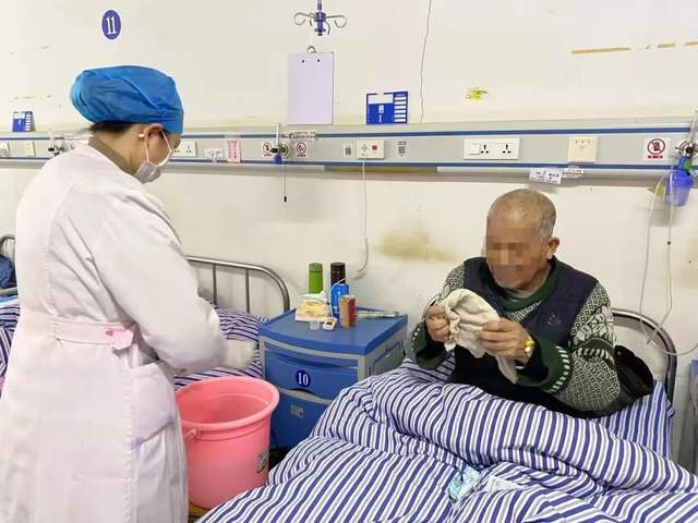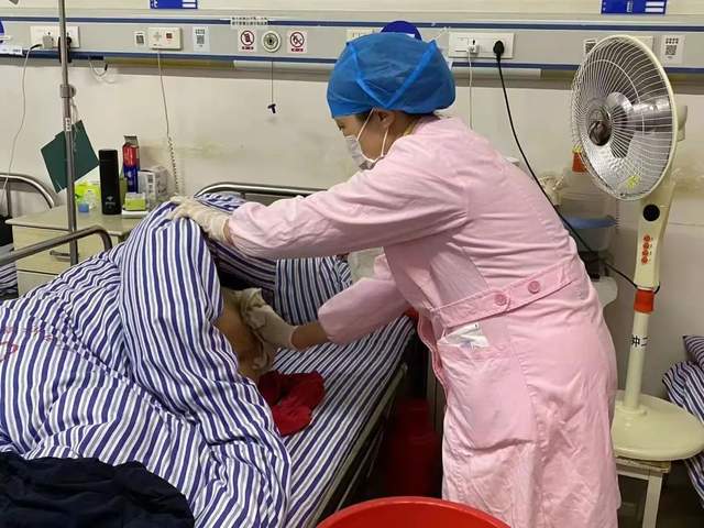 得知患者沒有換洗衣服,楊銀妹護(hù)士長立刻送上科里備用的衣服,打好熱水,拿來取暖器,幫他們洗臉、泡腳、更換衣服。
