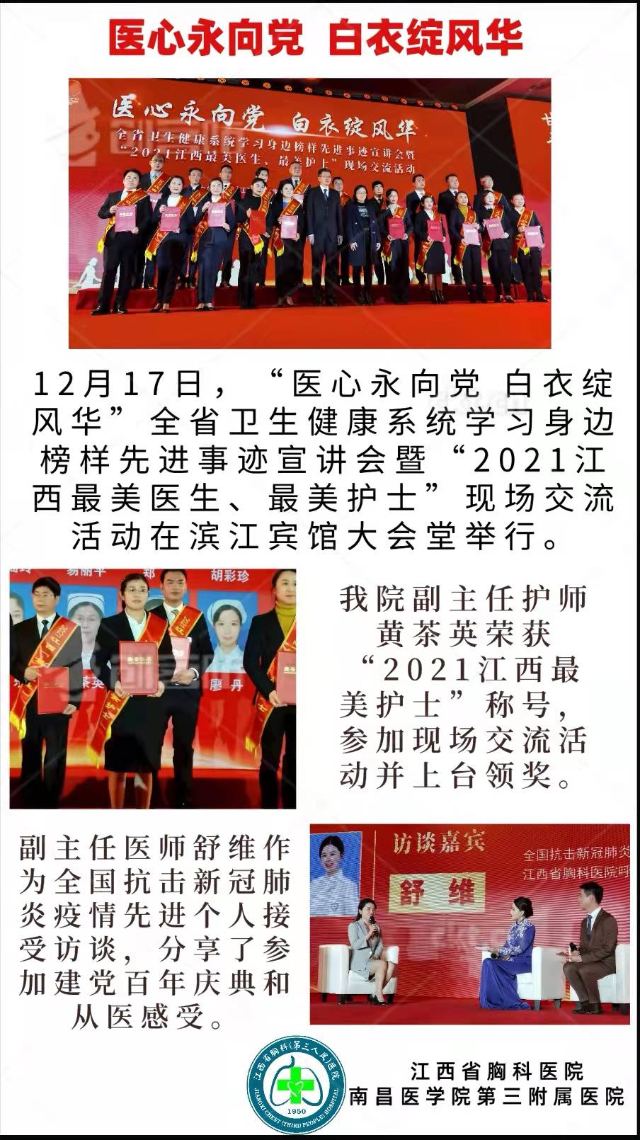 12月17日下午,省衛(wèi)生健康委舉辦“醫(yī)心永向黨,百年綻風(fēng)華"一一"2021江西最美醫(yī)生、最美護士”人物發(fā)布、頒發(fā)證書儀式,我院護士長黃茶英作為“2021江西最美護士”榮譽獲得者上臺領(lǐng)取證書;副主任醫(yī)師舒維作為"全國抗擊新冠肺炎疫情先進個人"接受現(xiàn)場訪談,深情講述參加建黨百年慶典和作為"醫(yī)三代"的從醫(yī)感受。