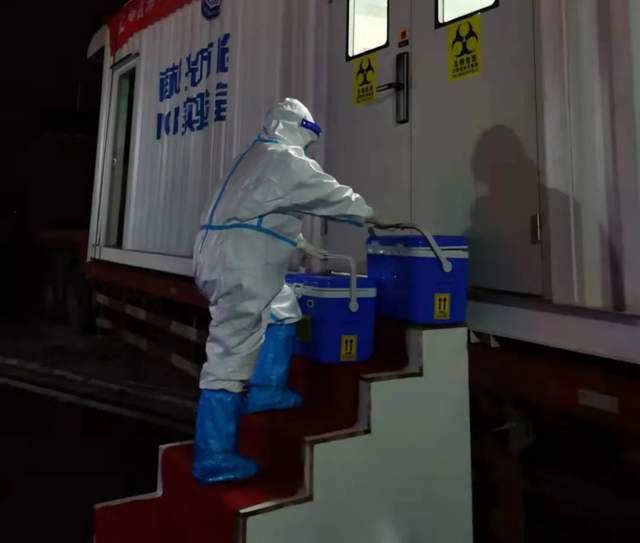 經過一天一夜的奮戰(zhàn),11月1日下午,我院2臺方艙檢測車能夠正常運行,搭建了6個臨時帳篷,分別是標本接送1間、防護物資存放1間,穿脫防護服3間、垃圾處置1間,按照規(guī)范流程順利完成了第一批標本的檢測。