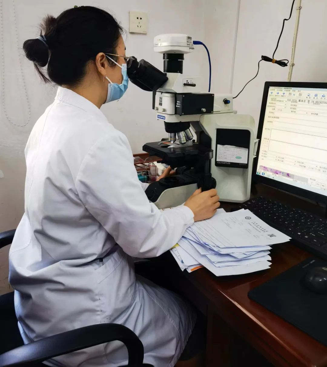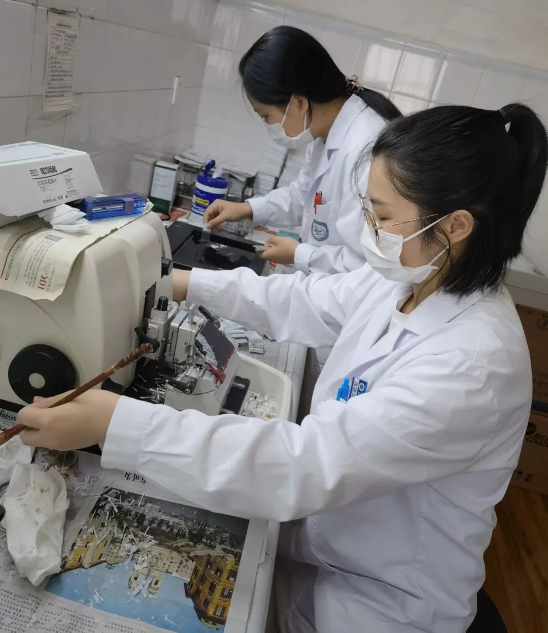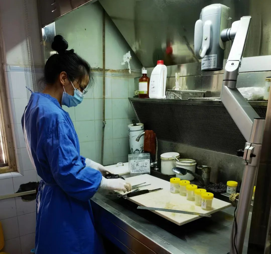 阮玉蘭醫(yī)師每天穿著厚厚的隔離衣,在取材室飽受福爾馬林的“熏陶”,一站就是一上午,但瘦弱的她依然咬牙堅持著;年輕的技術員陳超、席建云、熊家豪、王淑敏經(jīng)常加班加點,及時把高質(zhì)量的片子送到診斷醫(yī)師手中。