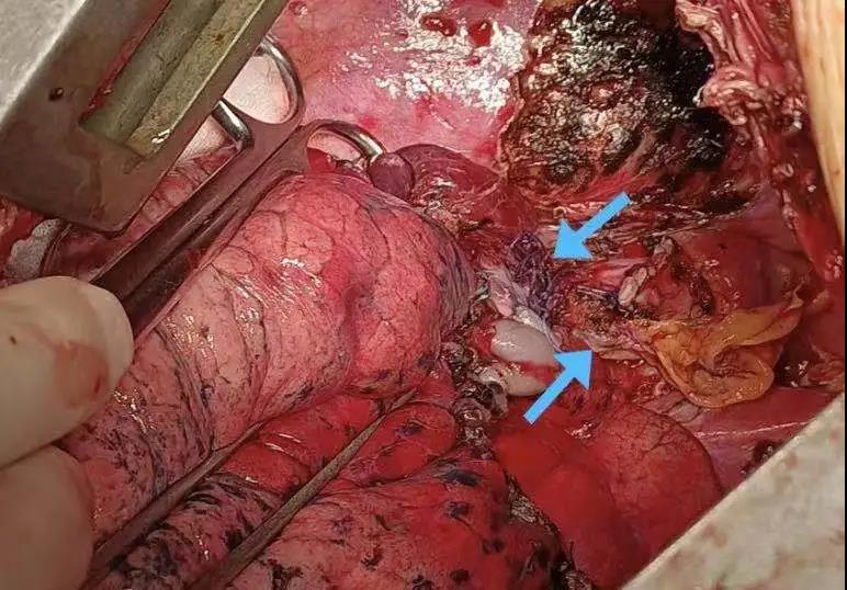完成吻合的支氣管及肺動脈吻合口