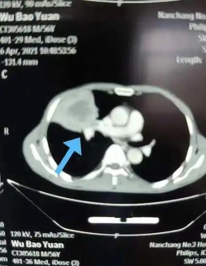 患者為一位56歲的中年男性患者,因咳嗽、痰中帶血2月余入院。術(shù)前胸部CT發(fā)現(xiàn)右肺中葉巨大軟組織腫塊,腫塊與右肺動脈關(guān)系密切。支氣管鏡檢查示中葉支氣管開口新生物。支氣管鏡活檢病理報告示鱗狀細胞癌。