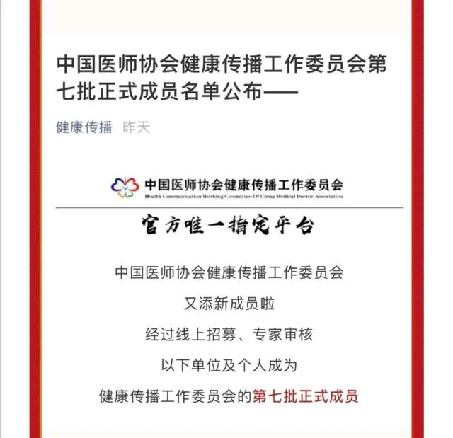 日前,中國(guó)醫(yī)師協(xié)會(huì)健康傳播工作委員會(huì)第七批正式成員名單發(fā)布,江西省第三人民醫(yī)院正式成為中國(guó)醫(yī)師協(xié)會(huì)健康傳播工作委員會(huì)成員。