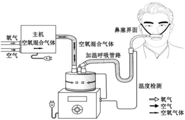 HFNC作為一種新的呼吸支持技術(shù)近些年來在臨床得到廣泛應(yīng)用,該治療設(shè)備主要包括空氧混合裝置、濕化治療儀、高流量鼻塞以及連接呼吸管路,主要關(guān)注于給患者提供相對恒定的吸氧濃度(21%~100%)、溫度(31~37 ℃)和濕度的高流量(8~80 L/min)氣體,并通過鼻塞進行氧療,具有很好的舒適性。