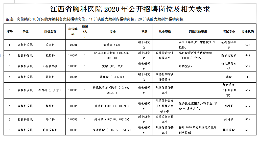 另外在原有招聘崗位數(shù)量上增加2個編制外崗位: 200109、200110崗,詳見附件3:《江西省胸科醫(yī)院2020年公開招聘崗位及相關(guān)要求》。