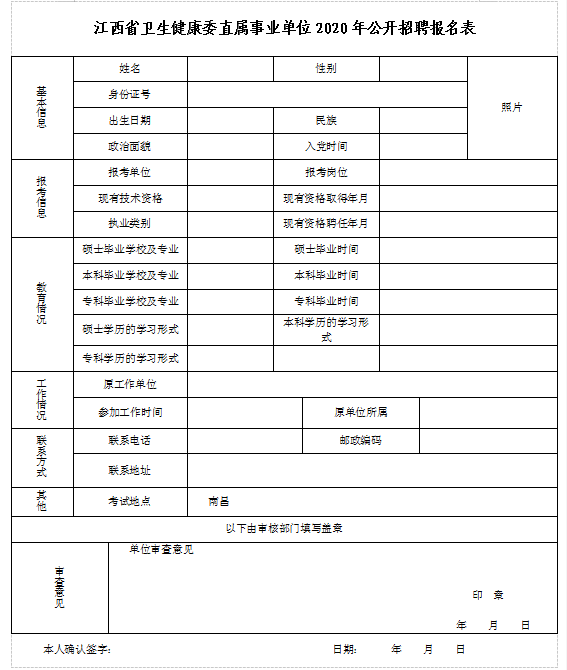 報名流程:考生需下載《江西省衛(wèi)生健康委直屬事業(yè)單位2020年公開招聘報名表》(附件1),按要求完整填寫報名信息后,將報名表(本人簽字)、個人身份證、學歷學位證(另附學信網(wǎng)在線學歷認證報告)、黨組織證明材料、執(zhí)業(yè)資格證或從業(yè)資格證、原工作單位人事部門出具的相關(guān)工作經(jīng)歷證明等崗位要求的相關(guān)材料(掃描件或相片),郵件標題及附件命名格式為:應(yīng)聘崗位+姓名+專業(yè)及方向+畢業(yè)院校,如“藥劑科+張三+中藥學+南昌大學”,發(fā)送至報名郵箱:462738974@qq.com。