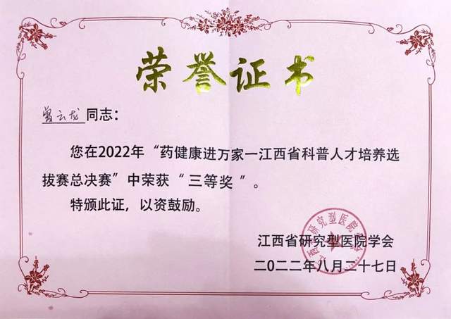 最終,曾云龍憑借穩(wěn)定發(fā)揮獲得三等獎,并受邀加入中國藥師協(xié)會“藥健康進萬家”科普宣教人才庫。