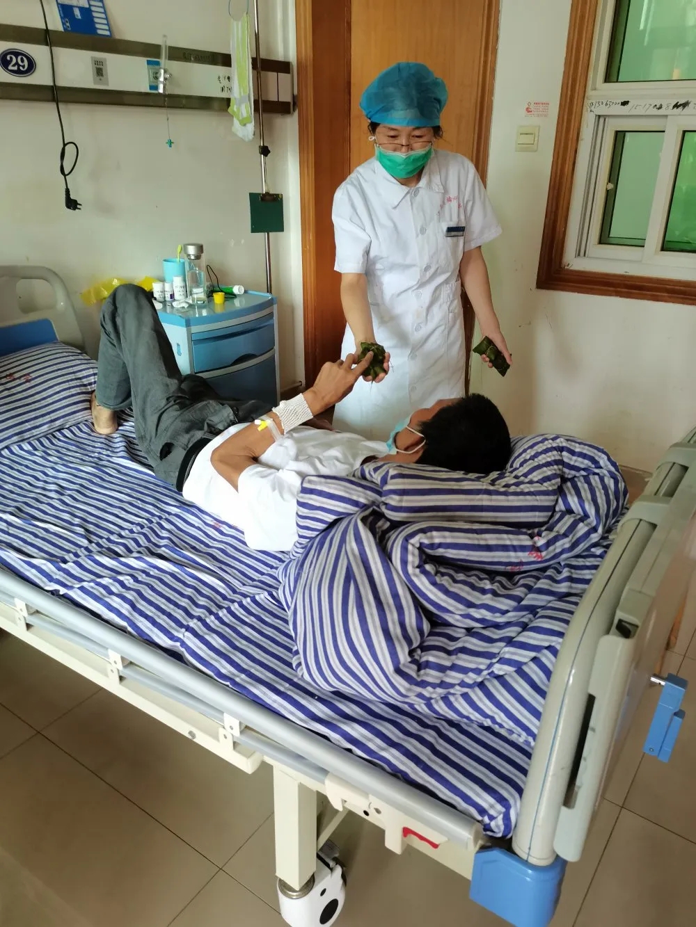 “愛心滿滿”——最后,病房為患者及家屬送上她們親手制作的愛心粽子,濃濃粽香滲透片片真情,患者及家屬雙手接過濃濃香粽,品嘗到了香甜的粽子,感受著情意濃濃的端午氣息和內(nèi)五科醫(yī)務(wù)人員的濃濃情意,露出了久違的笑容。疾病無情人有情,通過這一個(gè)個(gè)香濃的粽子,傳遞出一份份真摯醫(yī)患情!讓每一位患者同普通人一樣切實(shí)感受到節(jié)日的氣氛和濃濃的溫暖。