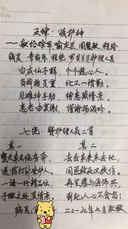 2019年7月24日,一位住院病人陳爺爺專門為省胸科醫(yī)院內(nèi)三科寫了五首抒情詩,以此對科里全體醫(yī)護人員的精心治療、貼心護理表示高度的贊揚和誠摯的感謝——