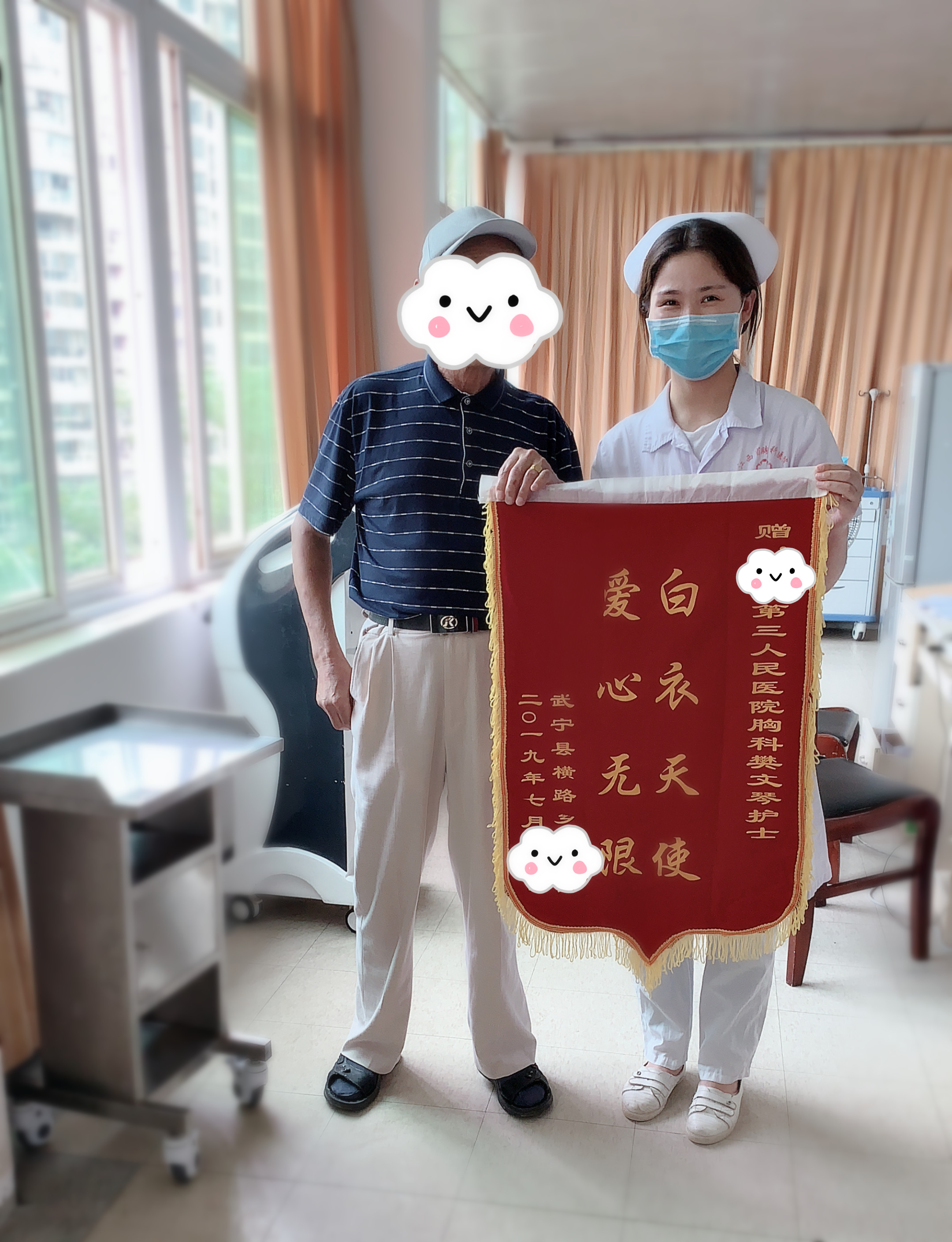 上午,我像往常一樣在咨詢室忙碌著,這時,潘老先生微笑著走進咨詢室喊到:“樊護士,你好呀!”我招呼他坐下休息等候,本以為他只是來找我開單體檢拿藥,只見他神神秘秘地從背后拿出了一面錦旗并展開,上面寫著“白衣天使,愛心無限”八個大字,錦旗上特別注明贈送給樊文琴護士,并向我深深的鞠了一個躬:“謝謝你一直以來的關(guān)心。”我有點措手不及,趕緊接過患者手中的錦旗,內(nèi)心百感交集……