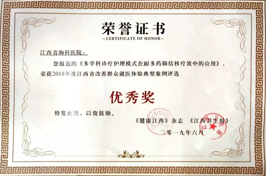 在剛剛結(jié)束的2018年度江西省改善群眾就醫(yī)體驗(yàn)典型案例評(píng)選活動(dòng)中,省胸科醫(yī)院護(hù)理部選送的作品《多學(xué)科診療護(hù)理模式在耐多藥肺結(jié)核療效中的應(yīng)用》經(jīng)省級(jí)評(píng)審小組審核,在全省240個(gè)案例中脫穎而出,獲得2018年度江西省改善群眾就醫(yī)體驗(yàn)典型案例評(píng)選優(yōu)秀獎(jiǎng)。