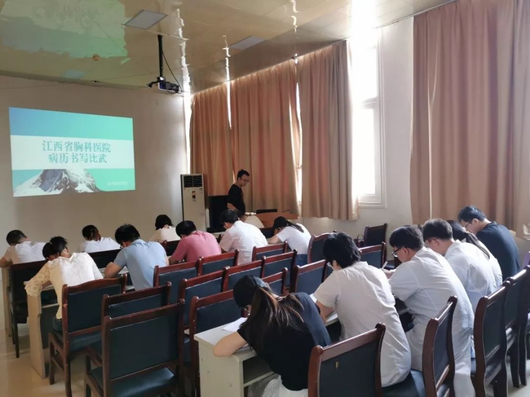 首個比武項目為病歷書寫技能,旨在強化病歷質(zhì)量,提高病歷內(nèi)涵,各臨床科室自考自薦一位醫(yī)師參加,其他科室醫(yī)師自愿報名參加。該項目以《病歷書寫基本規(guī)范(2010)》為標(biāo)準(zhǔn),內(nèi)容包括線上理論測試和現(xiàn)場病歷書寫。線上理論測試后上交手機,播放入院患者問診后自訴視頻(模擬)、體格檢查結(jié)果、檢查報告等,現(xiàn)場書寫首次病程記錄,賽場氛圍嚴(yán)肅緊張。此次項目將評選出6位醫(yī)師在醫(yī)師節(jié)表彰會進行現(xiàn)場表彰。