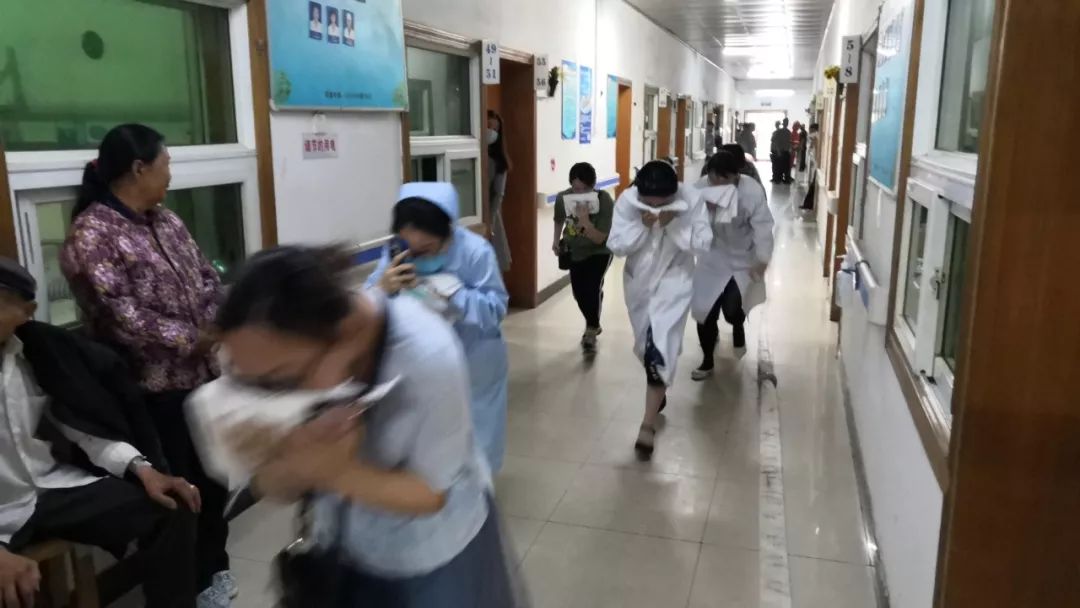 在內(nèi)一科的火災(zāi)緊急疏散演練現(xiàn)場(chǎng),當(dāng)發(fā)布火情報(bào)警信號(hào)后,醫(yī)護(hù)人員首先通知保衛(wèi)科人員,安慰并指導(dǎo)患者和家屬做好自我防護(hù),科室醫(yī)護(hù)人員、保衛(wèi)科人員和專業(yè)消防人員先后趕到起火現(xiàn)場(chǎng),用滅火器對(duì)火源進(jìn)行初期控制,并模擬火勢(shì)較大無法控制的情景,保衛(wèi)科人員立即組織醫(yī)務(wù)人員和患者及家屬緊急疏散至安全地帶。