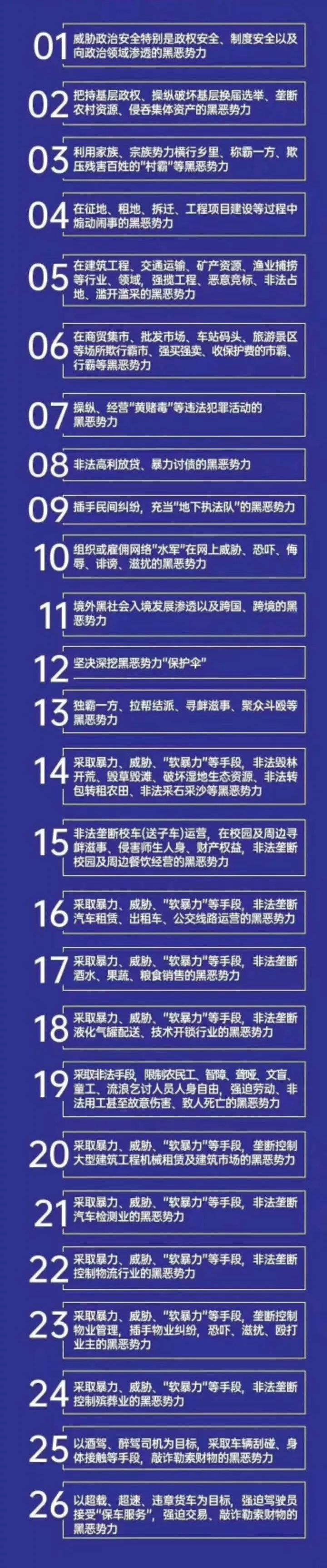 掃黑除惡之初,兩高兩部《關(guān)于辦理黑惡勢(shì)力犯罪案件若干問(wèn)題的指導(dǎo)意見(jiàn)》(法發(fā)〔2018〕1號(hào)),明確了12個(gè)掃黑除惡重點(diǎn)領(lǐng)域。隨著掃黑除惡專項(xiàng)斗爭(zhēng)的不斷深入,一些新的黑惡勢(shì)力表現(xiàn)形式也逐漸浮出水面。為加強(qiáng)摸排打擊針對(duì)性,很多地區(qū)增加了掃黑除惡重點(diǎn)領(lǐng)域,比如哈爾濱市掃黑辦將掃黑除惡打擊重點(diǎn)補(bǔ)充為26類。