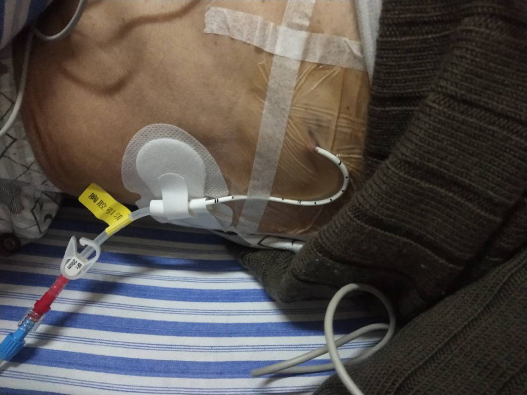 床旁胸片提示左側(cè)氣胸,左側(cè)肺部大部分壓迫,有多年臨床經(jīng)驗的鄧醫(yī)師立即給老人行胸腔閉式引流術(shù),消毒、局部麻醉、穿刺、置管、外接閉式引流瓶,手術(shù)治療一氣呵成,術(shù)后患者呼吸困難迅速得到緩解,嘴唇紫紺逐漸轉(zhuǎn)為紅潤,血氧飽和度監(jiān)測指標回升,搶救成功,為此忙碌的每一位醫(yī)護人員這才松了一口氣,繼續(xù)其他患者的診治工作。