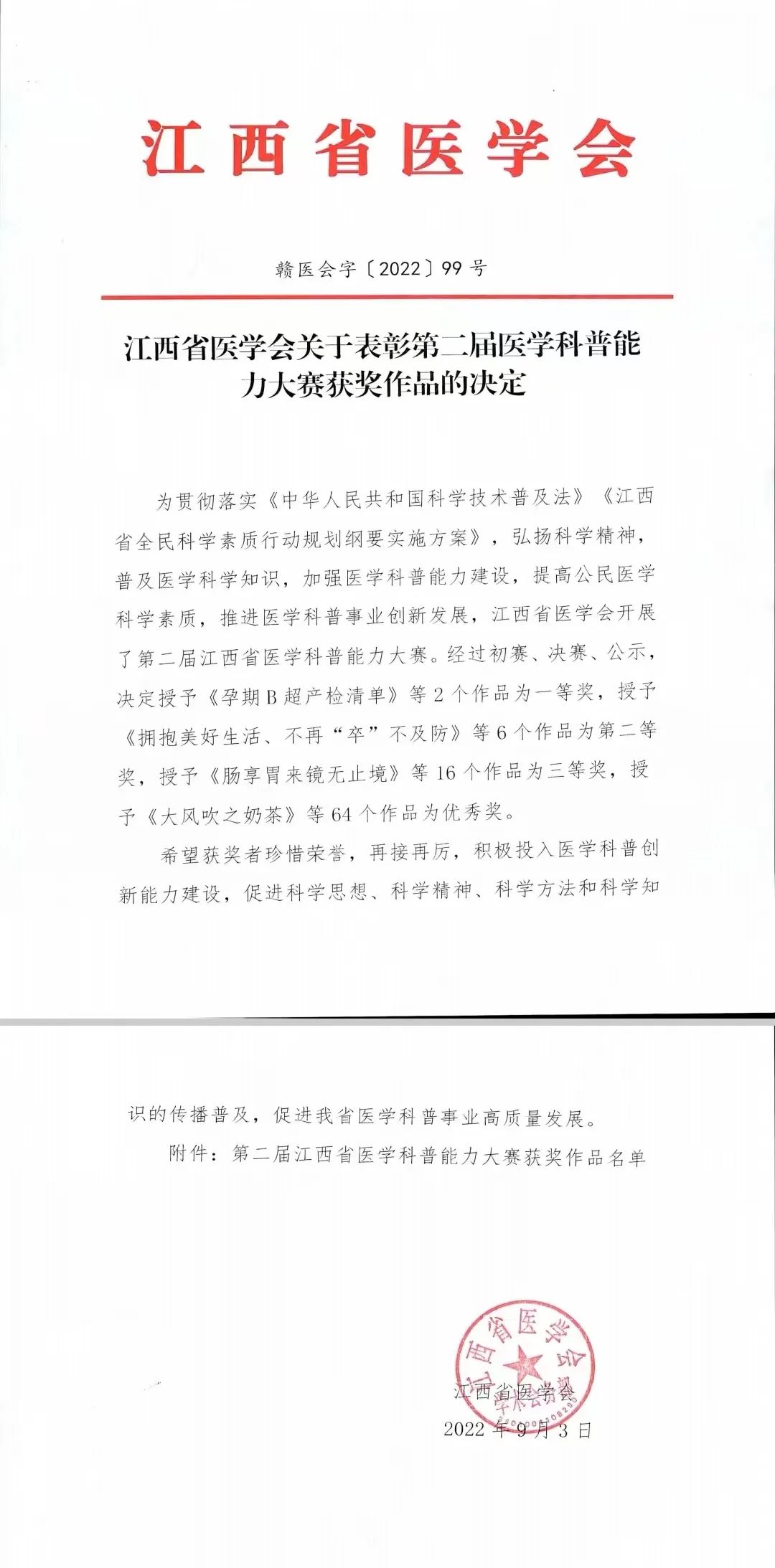 為提高醫(yī)學(xué)科普能力、挖掘醫(yī)學(xué)科普人才,引領(lǐng)和推動(dòng)江西醫(yī)學(xué)科普事業(yè)繁榮發(fā)展,江西省醫(yī)學(xué)會(huì)舉辦了第二屆江西省醫(yī)學(xué)科普能力大賽。本次大賽共收集了212個(gè)作品,經(jīng)過(guò)初賽、決賽、公示,最終評(píng)選出一等獎(jiǎng)2項(xiàng)、二等獎(jiǎng)6項(xiàng)、三等獎(jiǎng)16項(xiàng)、優(yōu)秀獎(jiǎng) 64 項(xiàng)。