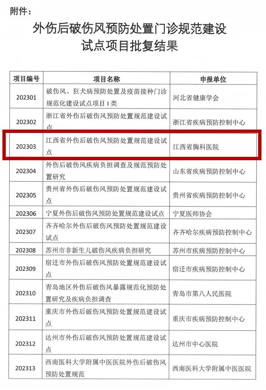 近日,從中華預防醫(yī)學會傳來喜訊,全國13家醫(yī)療機構被獲批外傷后破傷風預防處置門診規(guī)范建設試點項目(以下簡稱破傷風預防處置門診項目),江西省胸科醫(yī)院(南昌醫(yī)學院第三附屬醫(yī)院)作為動物致傷會主委單位名列其中,這也是江西省醫(yī)療機構中唯一獲批此項目的醫(yī)院。