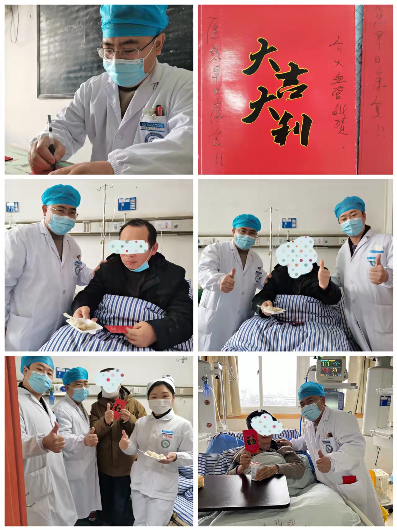 春節(jié)是中國的傳統(tǒng)佳節(jié),無論身在何方,回家團(tuán)圓都是家人的期盼,是一年中最重要的團(tuán)聚日子。在醫(yī)院這個(gè)特殊的地方,春節(jié)期間總有部分患者不能返回家中與家人團(tuán)圓、共度新春佳節(jié)。為了讓患者在醫(yī)院也能夠感受到過年的溫暖和年味,介入血管科護(hù)士長車?yán)嘣缭绲鼐蜑榛颊呒芭阕o(hù)家屬準(zhǔn)備了手工水餃,主任醫(yī)師王雪梅巧用醫(yī)學(xué)金句寫春聯(lián)為患者送祝福,美小護(hù)們也紛紛用中國結(jié)、福字、燈籠把病區(qū)裝扮得十分溫馨、喜慶。