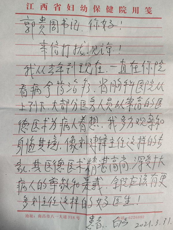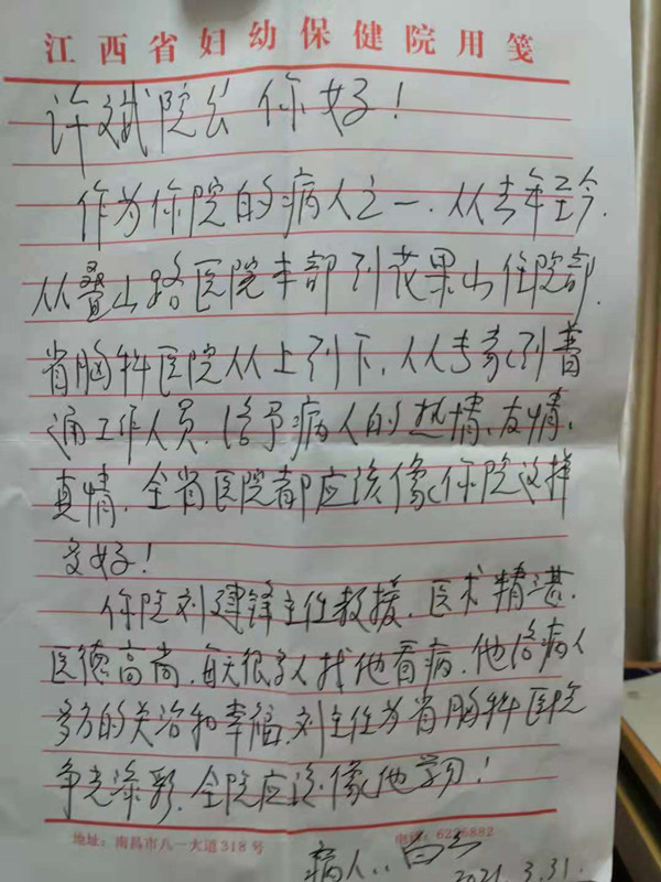 對于患者的真摯來信,劉主任也十分動容,“現(xiàn)在通信技術(shù)這么發(fā)達(dá),手寫感謝信的患者已經(jīng)不多了,謝謝患者對我們工作的肯定。能夠讓患者滿意,這也是作為一名醫(yī)生的意義所在!”