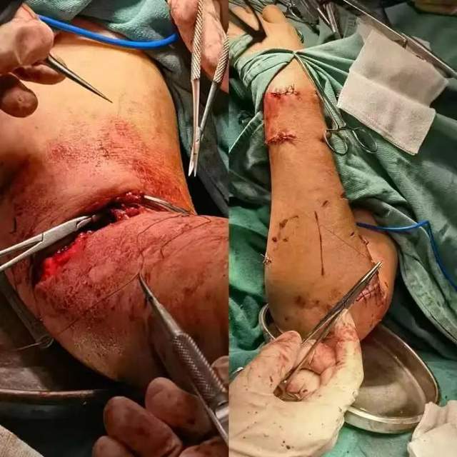 據(jù)宋女士的主治醫(yī)師蔡源恩介紹,患者入院時(shí)傷勢非常嚴(yán)重,全身多處大面積咬傷、抓痕,雙上肢及右下肢肢體麻木,手指無法正常活動。送入重癥監(jiān)護(hù)室前,急診科醫(yī)護(hù)人員使用專用的醫(yī)用外傷沖洗設(shè)備及醫(yī)用犬傷創(chuàng)口消毒液清洗傷口,為患者接種了狂犬疫苗和狂犬免疫球蛋白,有效地預(yù)防了狂犬病發(fā)生。6月18日,副院長張齊龍主任團(tuán)隊(duì)、急診科負(fù)責(zé)人汪濤聯(lián)合外院專家為患者進(jìn)行血管、神經(jīng)、肌腱吻合及清創(chuàng)縫合治療。歷時(shí)4個(gè)多小時(shí),手術(shù)順利完成。術(shù)后,患者回到重癥監(jiān)護(hù)室繼續(xù)接受觀察、治療。