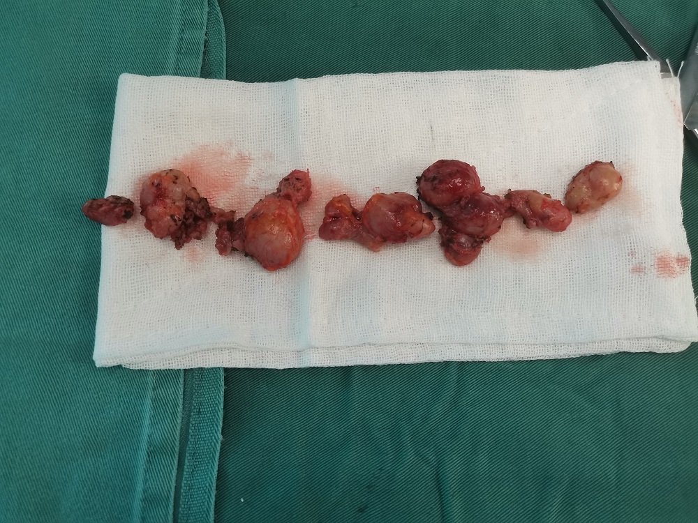 近日,患者蔣先生發(fā)現(xiàn)右頸部鎖骨上窩有可捫及包塊,大小約7*5cm,自述一個(gè)月前在我院查出頸淋巴結(jié)核,給予抗結(jié)核藥治療后,帶藥出院。近半個(gè)月右頸部包塊腫大明顯,無(wú)疼痛紅腫,收入我院胸外三科治療。經(jīng)細(xì)致討論病情,決定由汪濤主治醫(yī)師為患者實(shí)施全麻下右頸淋巴結(jié)結(jié)核病灶清除術(shù)。手術(shù)進(jìn)行非常順利,術(shù)中出血僅20ml。