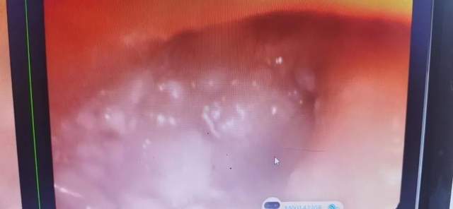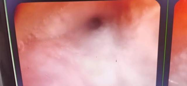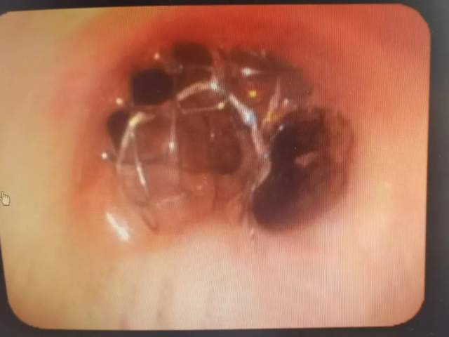 情況危急,需緊急置入支架緩解壓迫窒息!陳中書教授立即組織介入團(tuán)隊(duì)討論手術(shù)方案。施天生主治醫(yī)師氣管鏡探查發(fā)現(xiàn),患者阻塞的管腔約90%,左右支氣管狹窄僅留一條縫隙通氣。