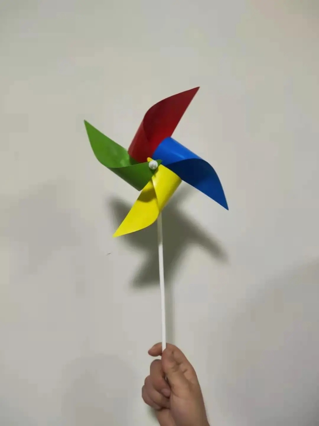 小風(fēng)車由黃、藍(lán)、綠、紅四片葉子和一根白色手柄組成,特別小巧輕便,只需用手握住白色的長柄,對著它吹氣就能使它轉(zhuǎn)動(dòng)起來,是不是特別的方便?