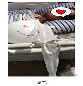 之后,可愛善良的“蝴蝶結(jié)”棉紗帶闖進我們的世界,她將管路上段固定于床旁。此法雖避免了上段管路的下墜,卻限制了管路長度。眾所周知,常用的呼吸機管路長度在150cm-170cm為宜,即方便翻身,又避免因管路過長引起管路內(nèi)冷凝水反流入濕化罐。特別在患者煩躁或護理翻身操作時可能牽拉管路,導(dǎo)致氣管導(dǎo)管的移位或脫落。因此,經(jīng)過多次臨床實踐,發(fā)現(xiàn)在管路的中下1/3處用系帶將呼吸機管路有效懸吊于呼吸機右側(cè),這樣即不會限制管路長度,又能保持積水杯的有效中立位(如圖二),解決了困擾許久的難題。充當(dāng)呼吸機管路支撐架的我“咸蛋超人”和棉紗帶“蝴蝶結(jié)”就這樣共同固定好呼吸機管道。
