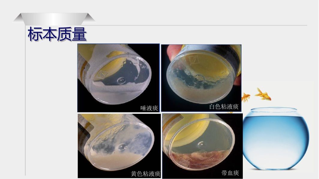 一般我們可以通過(guò)肉眼觀察來(lái)判斷痰標(biāo)本是否合格,質(zhì)量達(dá)標(biāo)的痰標(biāo)本,其性狀如蛋白粘液,或如膿液,或痰中帶血,不達(dá)標(biāo)的痰標(biāo)本,其性狀稀清,有水泡。
