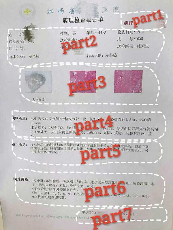 1病理報告的組成部分?Part1是病理號,這是患者在病理科對應(yīng)的獨有號碼牌,亦即相當(dāng)于患者的身份證,每位患者都是獨一的,病理科的所有資料都是對應(yīng)這個病理號;
