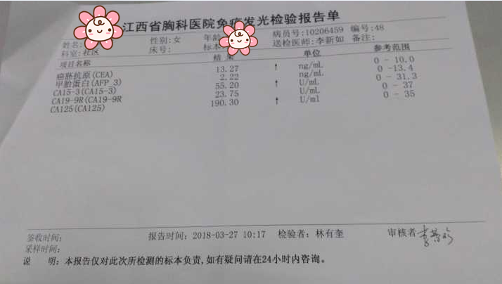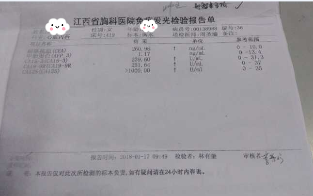 沒錯,羅婆婆被查出癌癥已經(jīng)快半年了。今年元月底,羅婆婆在她親人的陪伴下來到省胸科醫(yī)院就診,診斷結(jié)果右側(cè)胸腔積液,并經(jīng)病理科檢查找到腺癌細(xì)胞,腫瘤五項相關(guān)指標(biāo)都特別高。