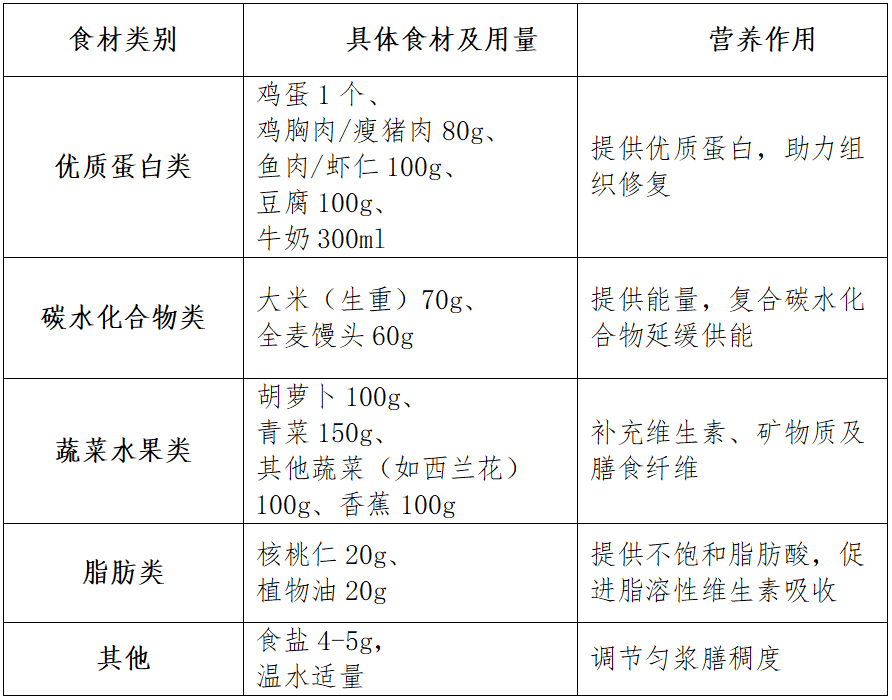 4.高蛋白配方勻漿膳。用于營養(yǎng)不良、術(shù)后恢復(fù)期、腫瘤等需要增加蛋白質(zhì)攝入的患者,蛋白質(zhì)占比提升至25%-30%,原料以優(yōu)質(zhì)蛋白(如雞蛋、牛奶、瘦肉、魚蝦)為主,助力組織修復(fù)和免疫力提升。