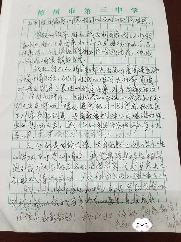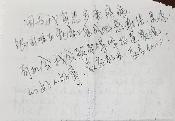 他在書信中描寫了感動(dòng),他說:“護(hù)士站幾位不知名的護(hù)士非常辛苦、非常耐心,給人特別是脆弱的病人真正心靈的溫暖。” 他還說:“我近期看病花了不少錢,家里負(fù)擔(dān)很重,省胸科醫(yī)院內(nèi)一科吳于青、姜國強(qiáng)兩位醫(yī)生給我制定了最佳的醫(yī)療方案,非常感謝!”