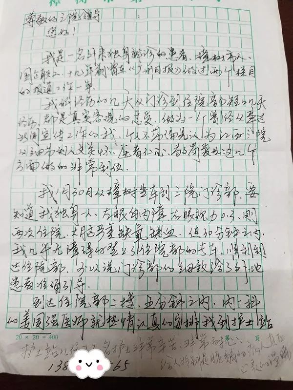 他在書信中描述了就診的經(jīng)歷,從省胸科醫(yī)院門診醫(yī)護(hù)人員的快速便捷細(xì)致的服務(wù)到院部醫(yī)護(hù)人員熱情及時(shí)周到的治療,他說:“門診部細(xì)致地給了外地患者準(zhǔn)確引導(dǎo),我?guī)缀鯚o障礙地登上了住院部的專車(因?yàn)獒t(yī)院有兩個(gè)院區(qū)),到達(dá)院部后五分鐘之內(nèi)就安排好了病床并及時(shí)問診、測體溫。”